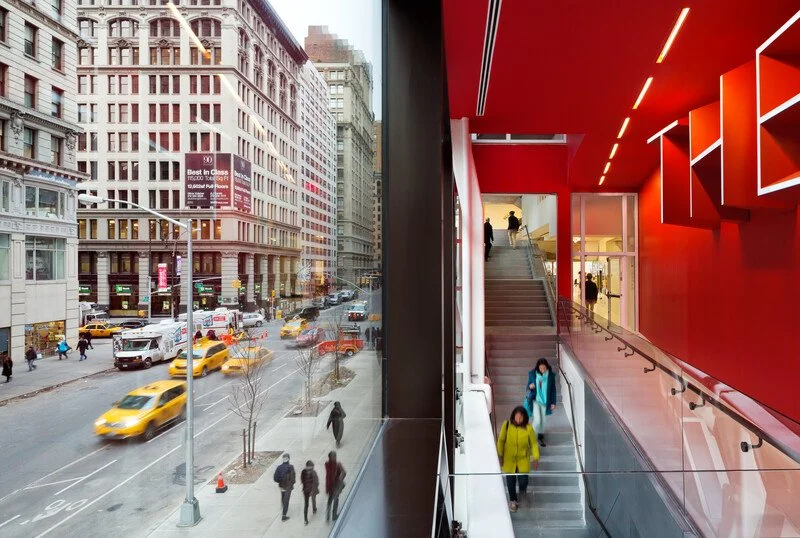 A sliced image of the inside of the New School and the outside street from TNS